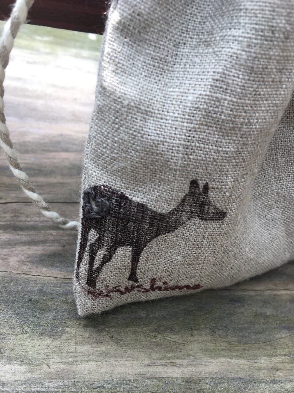 厚めのリネン素材で表地、裏地共布で作りました。紐もリネンで、糸は綿です。